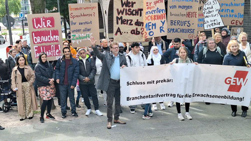 In Hamburg haben am 26.09.2025 etwa 200 KollegInnen zum Teil mit Kursteilnehmenden bei strahlendem Sonnenschein am Aktionstag „Sprache ist der Schlüssel zur Integration“ teilgenommen. Treffpunkt war um 12 Uhr die Behörde für Inneres und Sport Johanniswall 4. Dort wurde das „Forderungspapier Gesamtprogramm Sprache“ übergeben und die ersten Reden von Dirk Mescher, Geschäftsführer der GEW Hamburg, Detlef Zunker, Leiter der Hamburger GEW-Fachgruppe Erwachsenenbildung, und einem Mitglied des SprecherInnenteams Bündnis DaF/DaZ gehalten. Von dort aus ging es durch die Hamburger Innenstadt zum Fahnenplatz am Jungfernstieg, wo Sven Quiring, der Vorsitzende der Hamburger GEW, und KollegInnen aus dem Gesamtprogramm Sprache Reden gehalten haben. Gegen 14 Uhr war die Veranstaltung beendet.